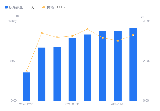 近一年(2024年12月31日至2025年11月30日),福莱新材A股股东户数从1.29万户,增加至3.3万户,增幅155.32%,区间股价上涨108.87%。