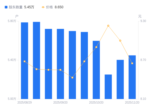 近一年(2024年11月20日至2025年11月10日),承德露露A股股东户数从4.74万户,增加至5.4万户,增幅13.89%,区间股价上涨2.96%。