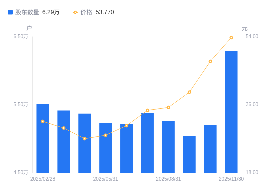 近一年(2024年11月30日至2025年11月30日),融捷股份A股股东户数从5.78万户,增加至6.29万户,增幅8.82%,区间股价上涨41.67%。