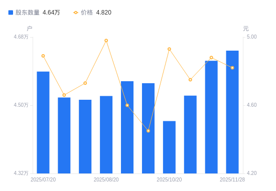 近一年(2024年12月20日至2025年11月28日),江阴银行A股股东户数从4.72万户,减低至4.64万户,降幅1.64%,区间股价上涨18.72%。