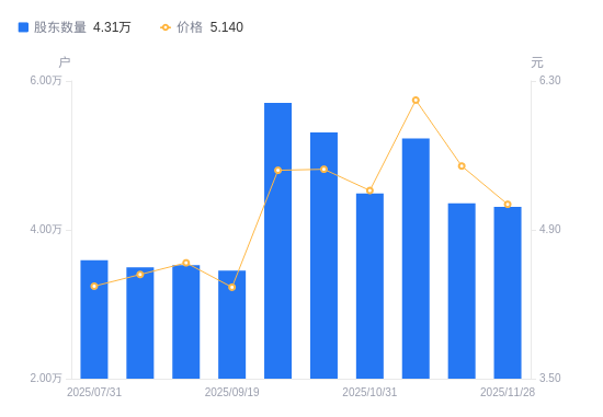 近一年(2024年12月10日至2025年11月28日),易成新能A股股东户数从4.28万户,增加至4.31万户,增幅0.60%,区间股价上涨0.19%。