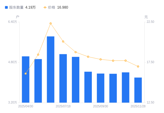 近一年(2024年12月31日至2025年11月28日),飞天诚信A股股东户数从5.06万户,减低至4.19万户,降幅17.16%,区间股价下跌6.81%。