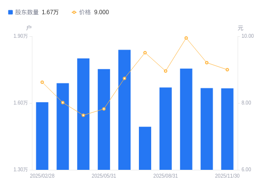 近一年(2024年11月30日至2025年11月30日),永吉股份A股股东户数从1.4万户,增加至1.67万户,增幅19.08%,区间股价下跌14.16%。