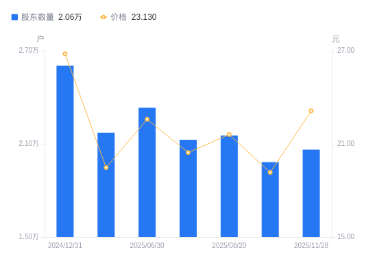 近一年(2024年12月31日至2025年11月28日),亚世光电A股股东户数从2.6万户,减低至2.06万户,降幅20.80%,区间股价下跌17.19%。