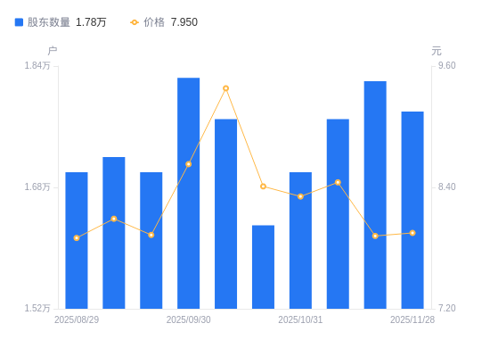 近一年(2024年12月10日至2025年11月28日),优彩资源A股股东户数从1.89万户,减低至1.78万户,降幅5.82%,区间股价上涨27.34%。