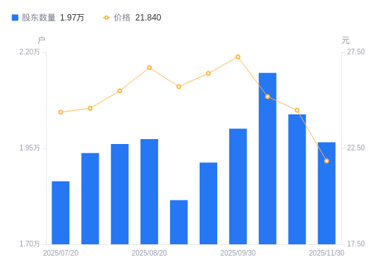 近一年(2024年12月31日至2025年11月30日),广大特材A股股东户数从8907户,增加至1.97万户,增幅120.70%,区间股价上涨40.59%。