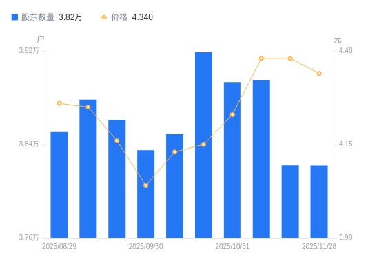 近一年(2024年11月29日至2025年11月28日),津药药业A股股东户数从4.22万户,减低至3.82万户,降幅9.34%,区间股价下跌2.73%。