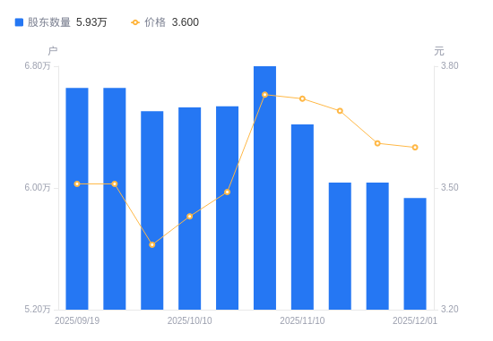 近一年(2024年12月10日至2025年12月1日),淮河能源A股股东户数从3.75万户,增加至5.93万户,增幅58.03%,区间股价下跌17.62%。