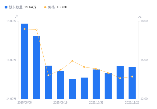 近一年(2024年11月29日至2025年11月28日),北方导航A股股东户数从9.53万户,增加至15.64万户,增幅64.11%,区间股价上涨30.14%。