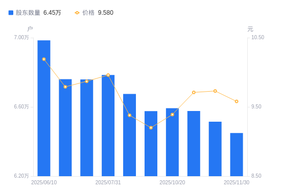 近一年(2024年12月20日至2025年11月30日),登海种业A股股东户数从6.96万户,减低至6.45万户,降幅7.36%,区间股价下跌6.82%。