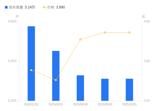 近一年(2024年12月31日至2025年10月31日),西安银行A股股东户数从5.57万户,减低至5.24万户,降幅5.94%,区间股价上涨7.16%。