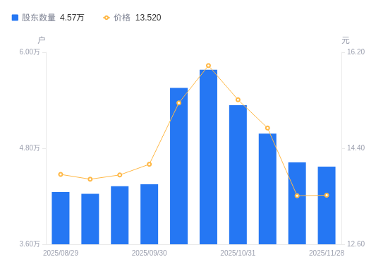 近一年(2024年12月10日至2025年11月28日),海得控制A股股东户数从4.21万户,增加至4.57万户,增幅8.65%,区间股价上涨12.01%。