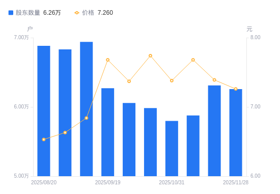 近一年(2024年11月29日至2025年11月28日),天康生物A股股东户数从7.11万户,减低至6.26万户,降幅11.95%,区间股价上涨12.56%。
