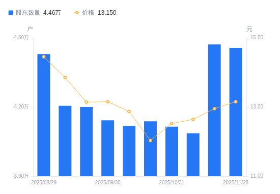 近一年(2024年11月29日至2025年11月28日),新开普A股股东户数从4.1万户,增加至4.46万户,增幅8.66%,区间股价上涨19.11%。