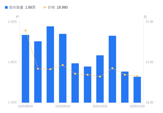 12月1日消息,数据显示,截至2025年11月28日,易明医药A股股东总户数为1.86万户,较上期(2025年11月20日)减少320户,降幅1.69%。公司最新A股总股本为1.91亿股,其中流通A股1.74亿股,户均持有流通A股数量为9370.37股,较上期增加158.45股,增幅1.72%;户均持流通A股市值17.78万元,较上期增加1441.37元,增幅0.82%。