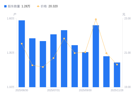 近一年(2024年11月29日至2025年11月28日),东方环宇A股股东户数从2.02万户,减低至1.28万户,降幅36.67%,区间股价下跌4.42%。