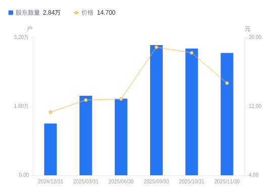近一年(2024年12月31日至2025年11月30日),皇马科技A股股东户数从1.2万户,增加至2.84万户,增幅136.10%,区间股价上涨27.55%。
