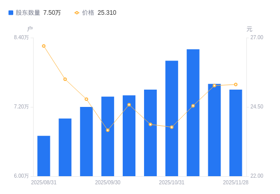 近一年(2024年11月29日至2025年11月28日),北新建材A股股东户数从5.3万户,增加至7.5万户,增幅41.51%,区间股价下跌7.51%。