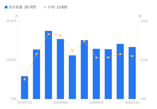 近一年(2024年11月20日至2025年11月10日),山河智能A股股东户数从10.05万户,增加至18.7万户,增幅86.04%,区间股价上涨73.95%。