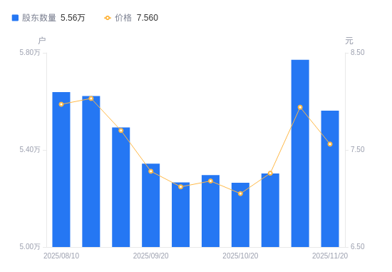 近一年(2024年11月20日至2025年11月20日),雅本化学A股股东户数从6.88万户,减低至5.56万户,降幅19.12%,区间股价下跌4.18%。