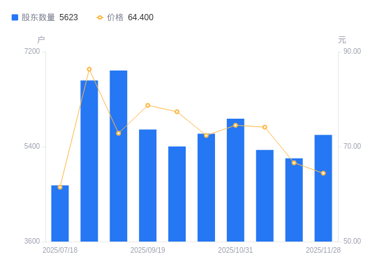 近一年(2024年12月31日至2025年11月28日),慧辰股份A股股东户数从3701户,增加至5623户,增幅51.93%,区间股价上涨83.74%。
