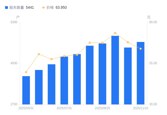 近一年(2024年12月31日至2025年10月31日),国力电子A股股东户数从3910户,增加至5194户,增幅32.84%,区间股价上涨62.81%。