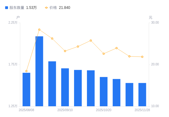 近一年(2024年12月20日至2025年11月28日),上海合晶A股股东户数从1.65万户,减低至1.53万户,降幅7.52%,区间股价上涨5.46%。