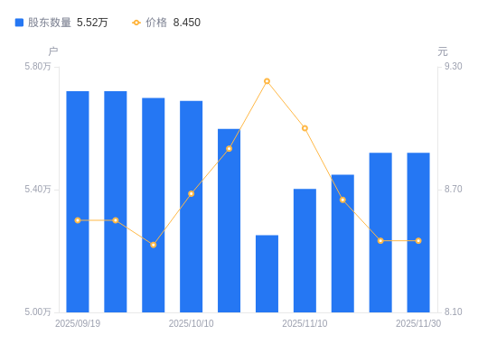 近一年(2024年11月29日至2025年11月28日),承德露露A股股东户数从4.66万户,增加至5.52万户,增幅18.50%,区间股价下跌2.66%。