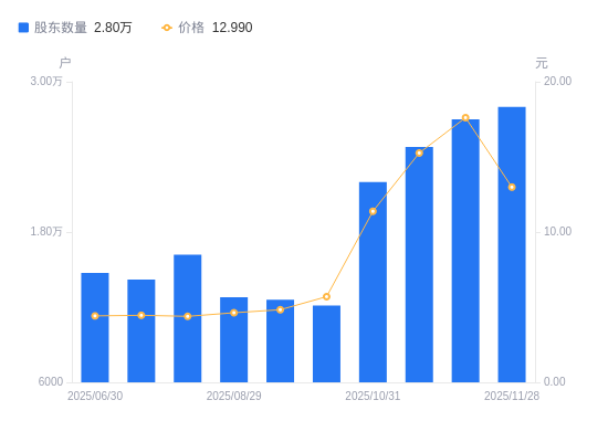 近一年(2024年11月29日至2025年11月28日),*ST东易A股股东户数从2.7万户,增加至2.8万户,增幅3.70%,区间股价上涨189.31%。