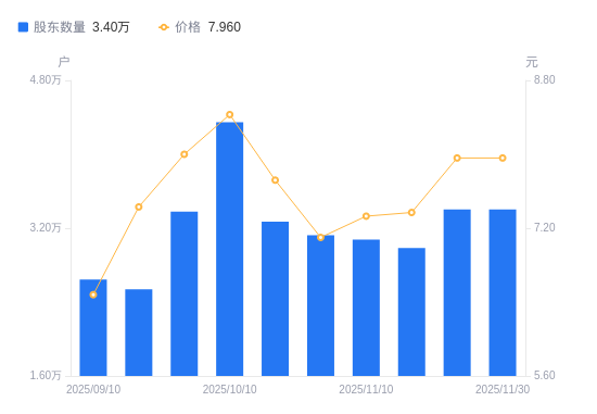 近一年(2024年12月20日至2025年11月28日),鼎信通讯A股股东户数从4.35万户,减低至3.4万户,降幅21.70%,区间股价上涨1.14%。