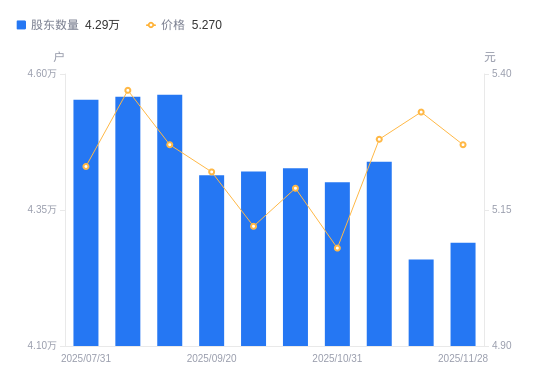 近一年(2024年11月30日至2025年11月28日),华锦股份A股股东户数从4.67万户,减低至4.29万户,降幅8.10%,区间股价上涨0.73%。