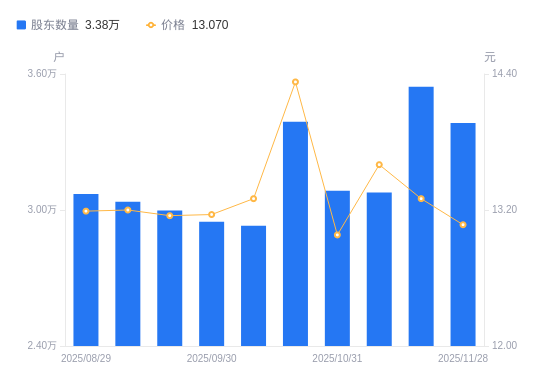 近一年(2024年11月29日至2025年11月28日),奥特迅A股股东户数从3.61万户,减低至3.38万户,降幅6.18%,区间股价上涨15.56%。