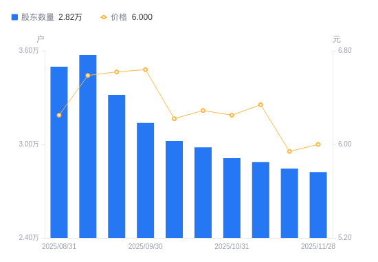 近一年(2024年11月29日至2025年11月28日),百纳千成A股股东户数从4.36万户,减低至2.82万户,降幅35.30%,区间股价下跌8.12%。