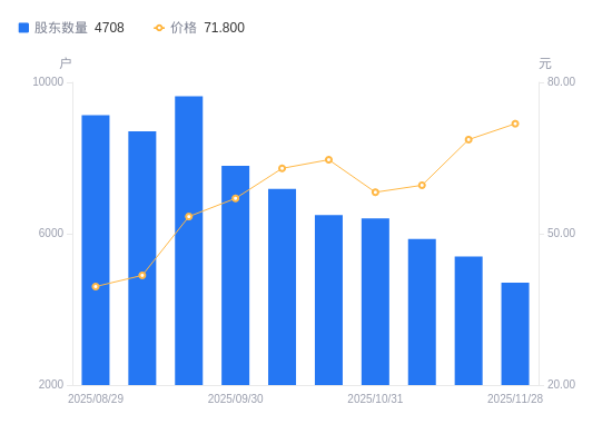 近一年(2024年11月29日至2025年11月28日),安联锐视A股股东户数从1.08万户,减低至4708户,降幅56.30%,区间股价上涨98.78%。