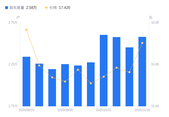 近一年(2024年11月29日至2025年11月28日),中铁装配A股股东户数从2.99万户,减低至2.58万户,降幅13.74%,区间股价下跌11.57%。