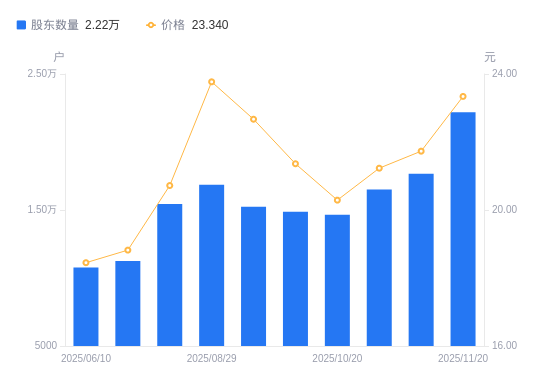 近一年(2024年11月20日至2025年11月20日),国安达A股股东户数从9996户,增加至2.22万户,增幅121.91%,区间股价上涨20.19%。
