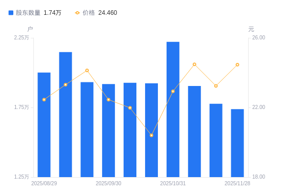 近一年(2024年12月31日至2025年11月28日),宇环数控A股股东户数从2.53万户,减低至1.74万户,降幅31.26%,区间股价上涨45.68%。