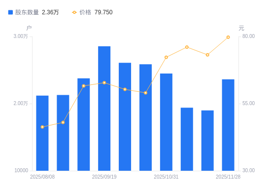 近一年(2024年11月29日至2025年11月28日),博杰股份A股股东户数从1.93万户,增加至2.36万户,增幅22.09%,区间股价上涨156.81%。
