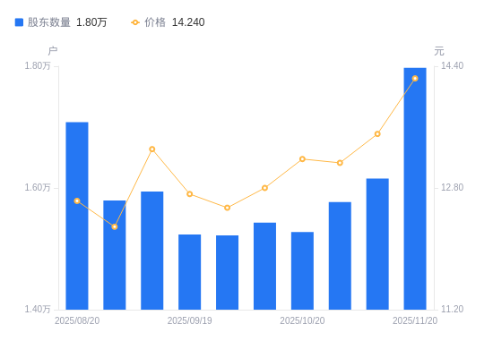 近一年(2024年9月20日至2025年9月19日),宏达高科A股股东户数从1.74万户,减低至1.52万户,降幅12.30%,区间股价上涨52.15%。