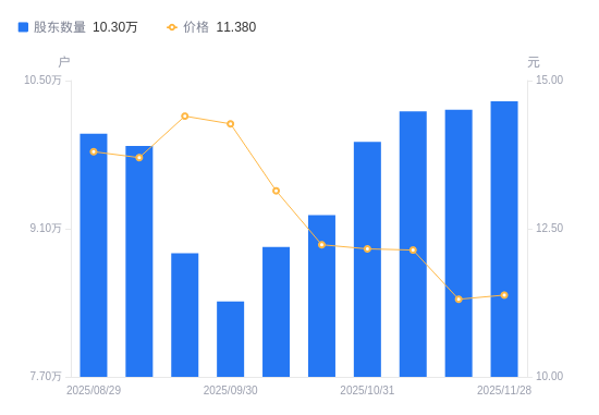 近一年(2024年12月20日至2025年11月28日),神州泰岳A股股东户数从10.53万户,减低至10.3万户,降幅2.12%,区间股价下跌8.96%。