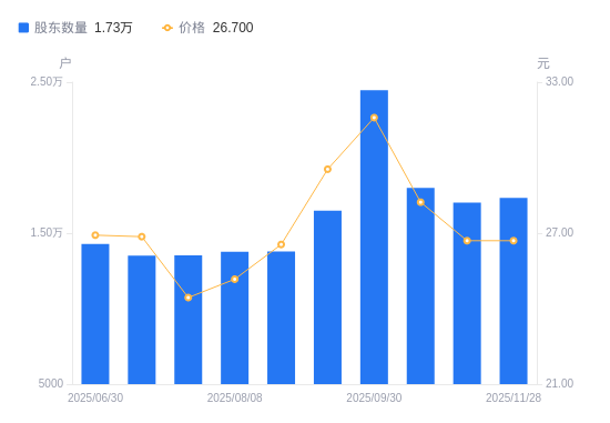 近一年(2024年11月29日至2025年11月28日),天山电子A股股东户数从1.24万户,增加至1.73万户,增幅40.13%,区间股价上涨90.61%。