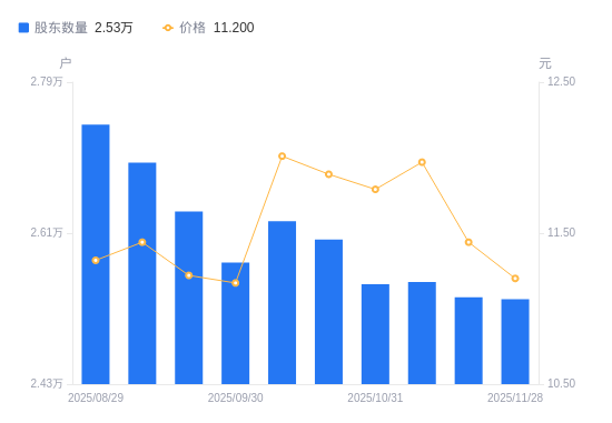 近一年(2024年11月29日至2025年11月28日),东莞控股A股股东户数从3.12万户,减低至2.53万户,降幅18.79%,区间股价上涨2.05%。