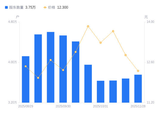 近一年(2024年12月20日至2025年11月28日),淮北矿业A股股东户数从4.86万户,减低至3.75万户,降幅22.79%,区间股价下跌7.66%。