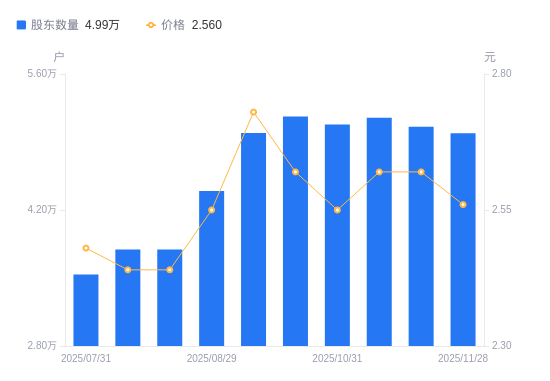 近一年(2024年11月29日至2025年11月28日),中南文化A股股东户数从4.14万户,增加至4.99万户,增幅20.64%,区间股价上涨2.81%。