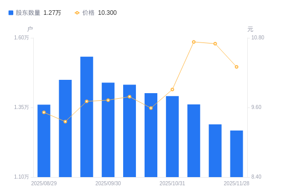 近一年(2024年11月29日至2025年11月28日),恒通股份A股股东户数从1.37万户,减低至1.27万户,降幅7.79%,区间股价上涨10.44%。