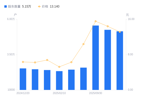 近一年(2024年11月20日至2025年11月20日),同洲电子A股股东户数从2.62万户,增加至5.15万户,增幅96.54%,区间股价上涨222.85%。