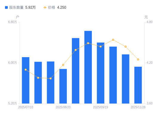 近一年(2024年11月29日至2025年11月28日),劲嘉股份A股股东户数从6.27万户,减低至5.92万户,降幅5.51%,区间股价下跌4.92%。