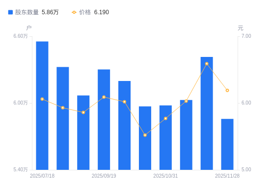 近一年(2024年11月29日至2025年11月28日),福能东方A股股东户数从8.96万户,减低至5.86万户,降幅34.60%,区间股价下跌30.29%。