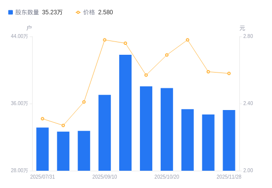 近一年(2024年11月29日至2025年11月28日),供销大集A股股东户数从34.69万户,增加至35.23万户,增幅1.56%,区间股价下跌14.85%。
