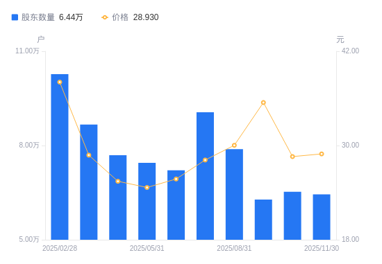 近一年(2024年11月30日至2025年11月30日),恒为科技A股股东户数从5.71万户,增加至6.44万户,增幅12.82%,区间股价上涨14.37%。